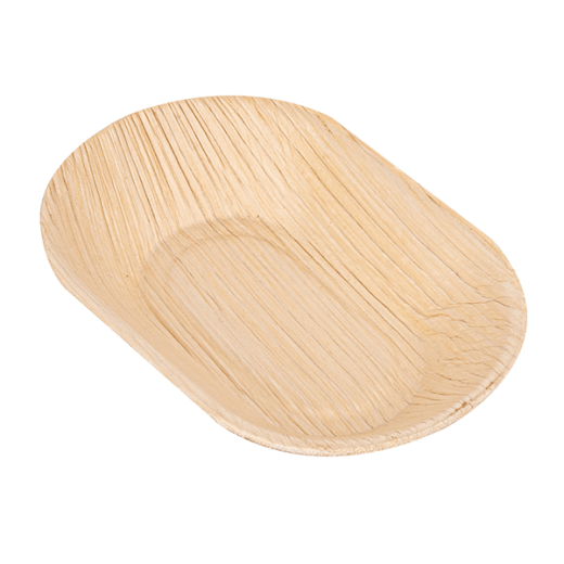 Assiette ovale en feuille de palme apte pour une utilisation au four à micro-ondes (jusqu'à 2 minutes) et au congélateur.