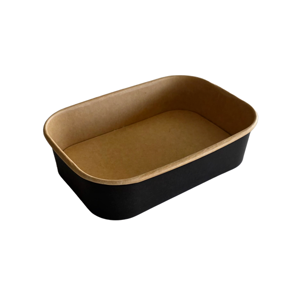 Bac rectangulaire en carton recyclable et biodégradable, idéal pour produits froids et chauds. Aptes pour le micro-ondes. Résiste aux graisses.