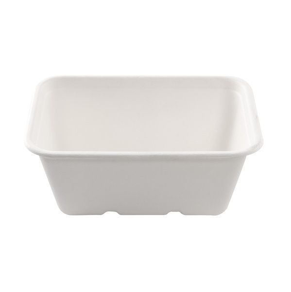 Bac rectangulaire en pulpe de canne à sucre et biodégradable et compostable, idéal pour produits froids et chauds. Aptes pour le micro-ondes. Résiste aux graisses.