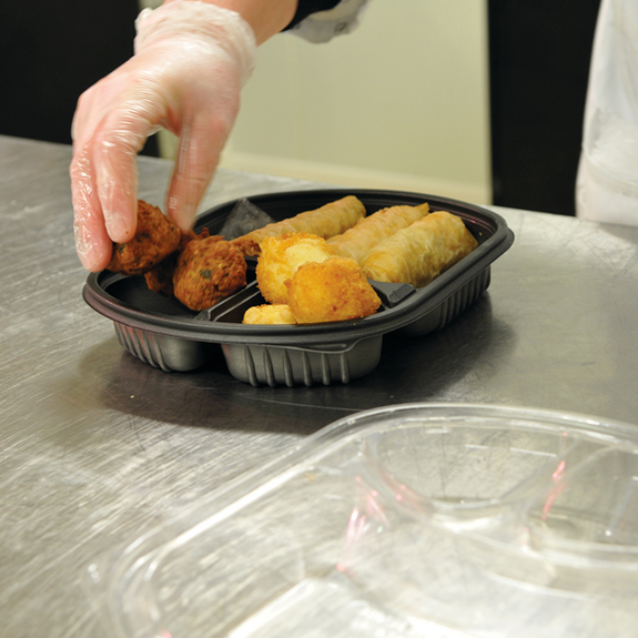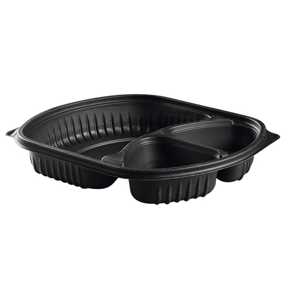 Plat trois compartiments en PP noire. Convient parfaitement aux activités de traiteur et de vente à emporter. Couvercles vendus séparément. Une boite micro-ondable et solide convenant pour tous vos plats à emporter avec une forme légèrement ovale plus élégante.