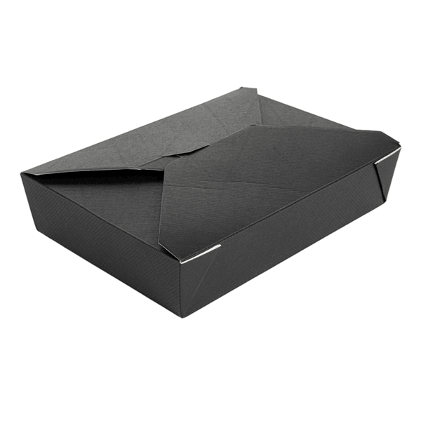 Boite américaine haute qualité avec fermeture, en carton ingraissable et étanche, micro-ondable. Interieur et extérieur plastifiés 230g/m² + 12µ PP.