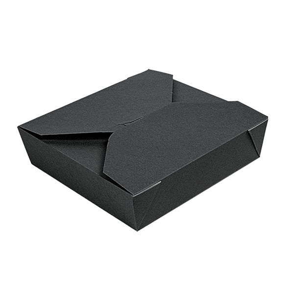 Boite américaine haute qualité avec fermeture, en carton ingraissable et étanche, micro-ondable. Interieur et extérieur plastifiés 250g/m² + 12µ PP.