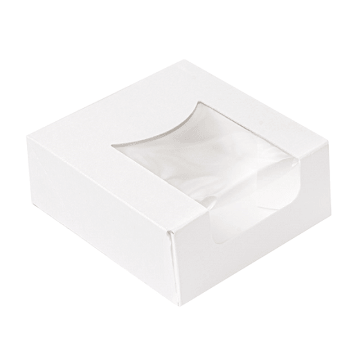 Boîte blanche recyclable, intérieur stuqué blanc laqué en carton ondulé nano micro triple couche 230 g/m² avec fenêtre transparente antibuée. Contient une couche interne de papier résistant à l'humidité et à la graisse grâce à un nouveau procédé de fabrication.