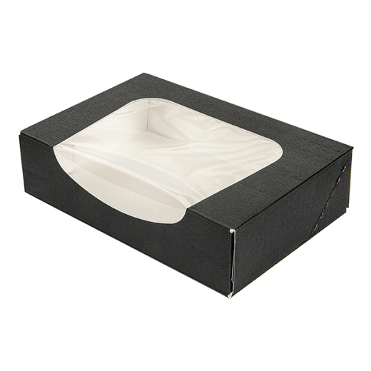 Boîte noire recyclable, intérieur stuqué blanc laqué en carton ondulé nano micro triple couche 230 g/m² avec fenêtre transparente antibuée. Contient une couche interne de papier résistant à l'humidité et à la graisse grâce à un nouveau procédé de fabrication.