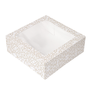Boîtes pâtissière de couleur Blanche avec décoration Or en carton ondulé nano micro triple couche 250 g/m². Contient une couche interne de papier résistant à l'humidité et à la graisse grâce à un nouveau procédé de fabrication.
