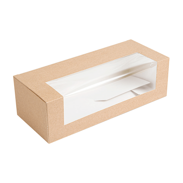 Boîtes pâtissière avec fenêtre en carton ondulé nano micro triple couche 240 g/m². Contient une couche interne de papier résistant à l'humidité et à la graisse grâce à un nouveau procédé de fabrication.