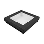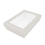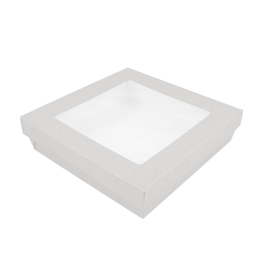 Boite en carton blanc 290 g/m² + 18 PE g/m² avec base étanche et couvercle avec fenêtre transparente antibuée.
