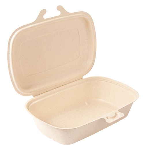Boite repas avec couvercle charnière, un compartiment, faites à 100% en pulpe de cellulose naturelle à partir de fibres de canne à sucre.