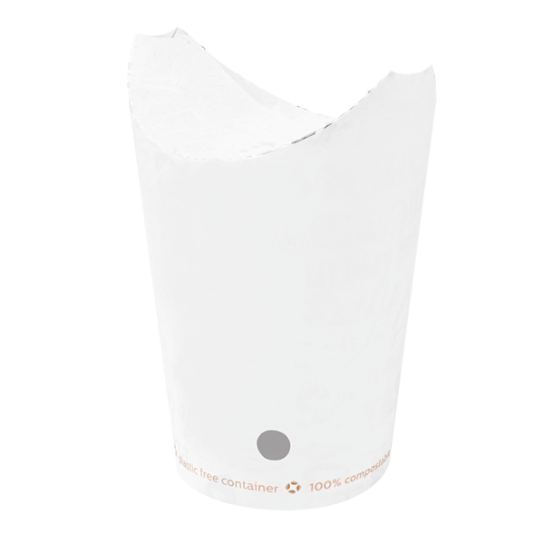Gobelet en carton avec fermeture rabattable épaisseur 242 g/m², sans aucun revêtement en plastique lui permettant d'être 100% compostable mais toujours résistant aux graisses et étanche pour frites, fish & chips, nuggets, churros...