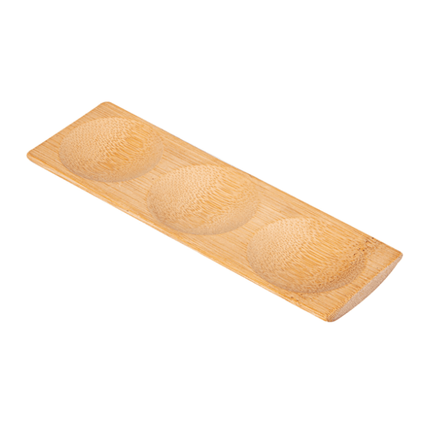 Mini assiette rectangulaire en bambou creusé en trois endroits pour une présentation épurée.