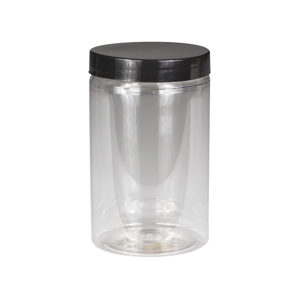 Récipient transparent en PET recyclable avec couvercle à vis noir en PET.