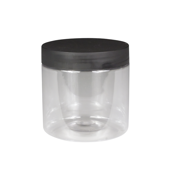 Récipient transparent en PET recyclable avec couvercle à vis noir en PET.