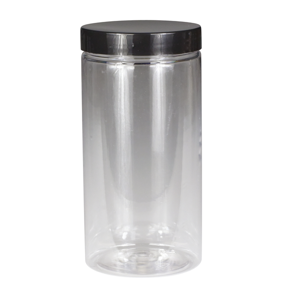 Récipient transparent en PET recyclable avec couvercle à vis noir en PET.