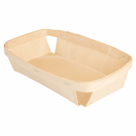 Récipient rectangulaire en bois, compatible avec un usage au four jusqu'à 120°C, résiste aux graisses.