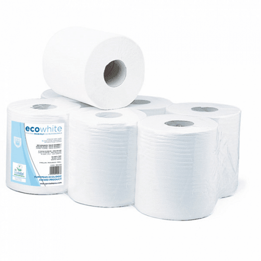 Rouleaux essuie-mains maxi barril . Pure cellulose blanche, 2 plis (19g/m2) et 82º de blancheur.