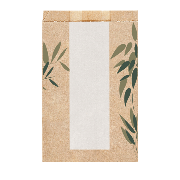 Sac à pain ou baguette, en kraft naturel 32 g/m² avec fenêtre transparente perforée en papier cristal 30g/m², modèle Feel Green.