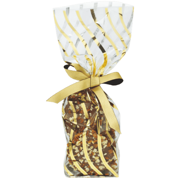 Le sachet confiseur Serpentin OR est partiellement métallisé grâce à la technique de la démetallisation. Seules certaines zones sont métallisées, afin de pouvoir laisser paraître le produit.