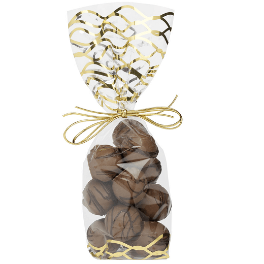 Le sachet confiseur Vague Or est partiellement métallisé grâce à la technique de la démetallisation. Seules certaines zones sont métallisées, afin de pouvoir laisser paraître le produit.