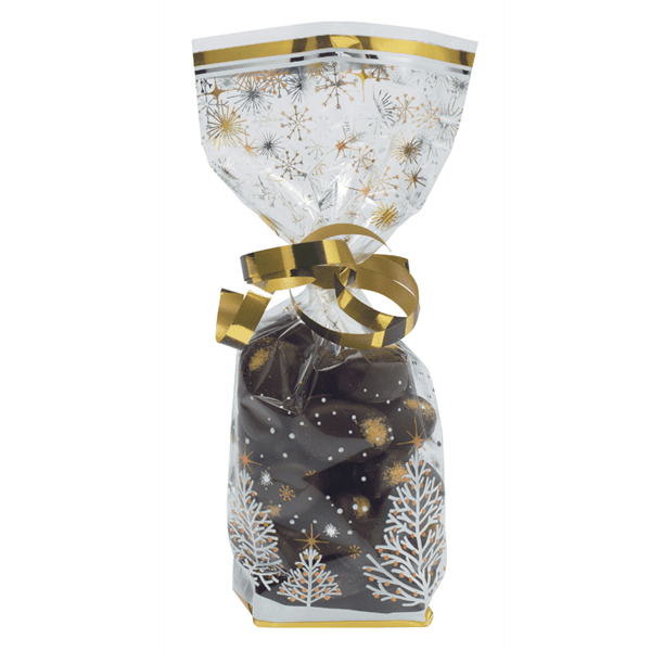 Le sachet confiseur Noël Scintillant est partiellement métallisé grâce à la technique de la démetallisation. Seules certaines zones sont métallisées, afin de pouvoir laisser paraître le produit.
