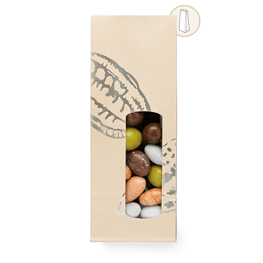 Sachet SOS Cabosse couleur Vanille avec fenêtre transparente. Quadri-matériaux papier/plastiques avec effet métallisé