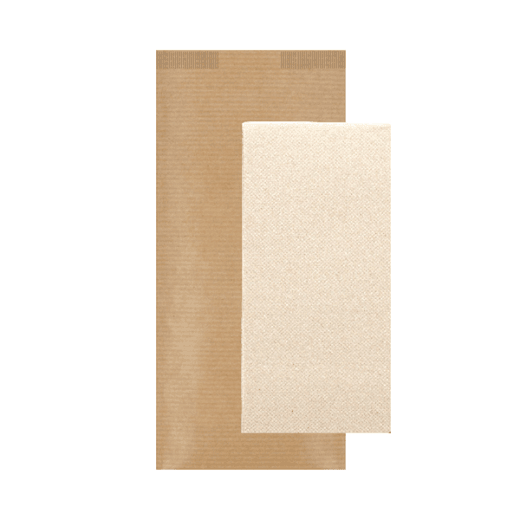 Serviettes emballés avec ouverture pour les couverts, pour que vous puissiez laisser les tables de la terrasse ou jardin préparées à l'avance sans compromettre l'hygiène des ustensiles dont vos clients auront besoin. Ce produit de la gamme Feel Green, utilise des matières premières recyclées ou choisies pour un impact environnemental nocif minimum. Le papier manille kraft pour le sac en papier et le papier tissu recyclé pour la serviette (100% recyclables et biodégradables et imprimés avec des encres compostables). Cette gamme inclut aussi le Double Point qui est différencié par leur haut volume et douceur finale obtenue du produit.