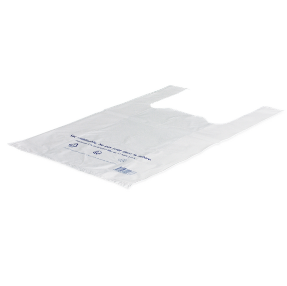 Sachet bretelle blanc réutilisable 50µ (conforme à la règlementation en vigueur), pour vente à emporter (poissonnerie, boucherie, épiceries, fruits et légumes..).
