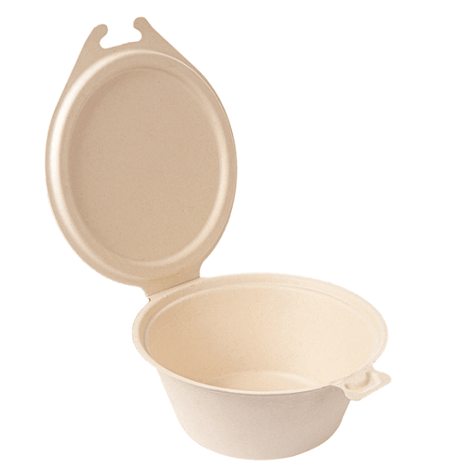 Récipient avec couvercle charnière fait à 100% en pulpe de cellulose naturelle à partir de fibres de canne à sucre.