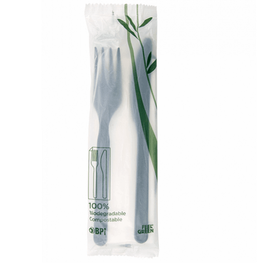 Set de couverts en CPLA (PLA cristallisé) comprenant une fourchette, un couteau réutilisable (Apte pour le lave-vaisselle 12 cycles) et une serviette .