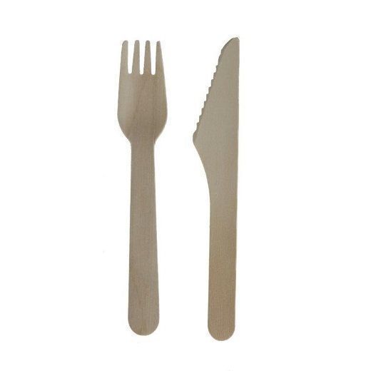 Set de couvert en bois de bouleau à usage unique emballée dans un sachet kraft individuel.