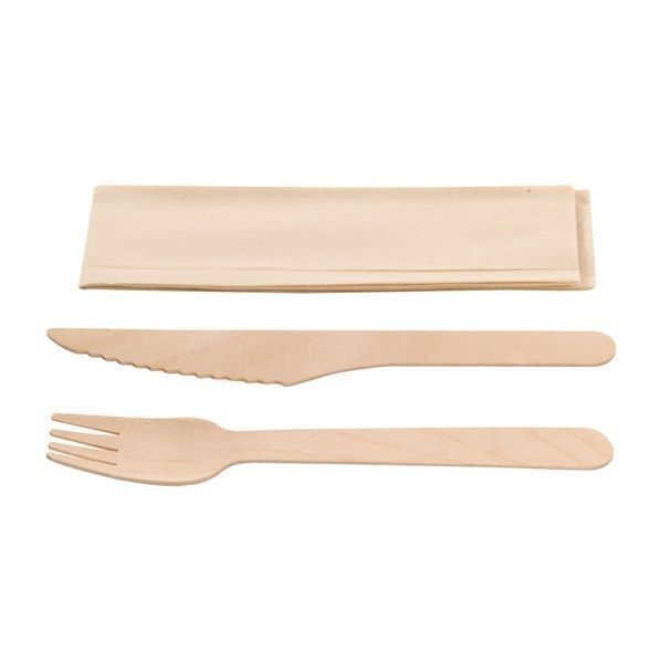Set de couvert en bois à usage unique emballée dans un sachet kraft individuel.