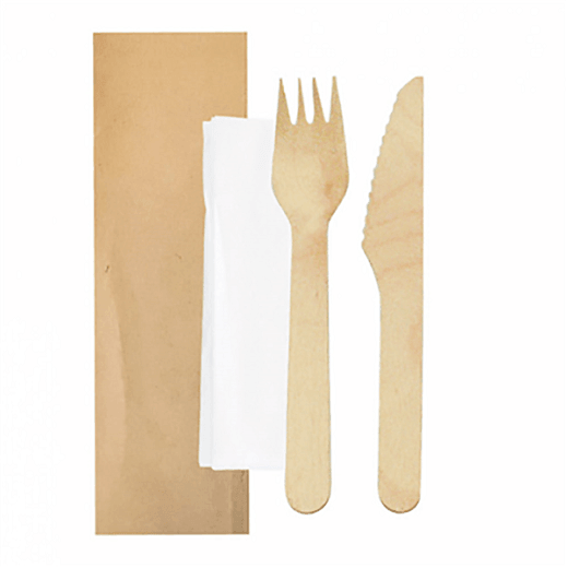 Set de couvert en bois de bouleau à usage unique emballée dans un sachet kraft individuel.