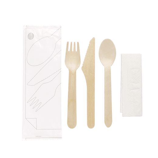 Set de couvert en bois de bouleau à usage unique emballée dans un sachet blanc individuel.