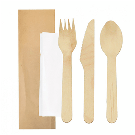 Set de couvert en bois de bouleau à usage unique emballée dans un sachet kraft individuel.
