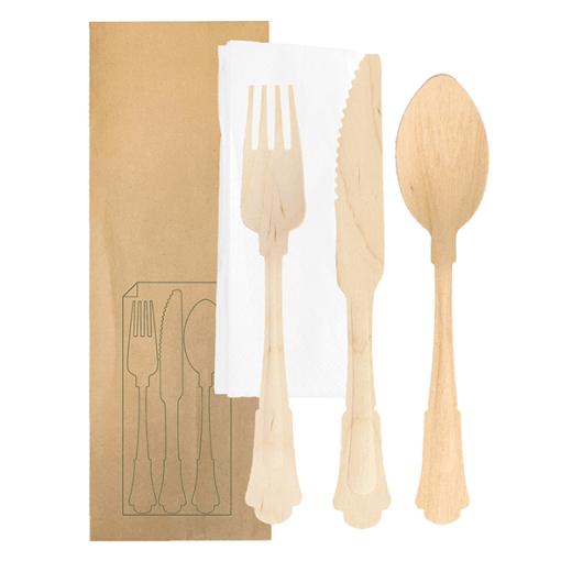 Set de couvert en bois de bouleau, modèle Classic, à usage unique emballée dans un sachet kraft individuel.