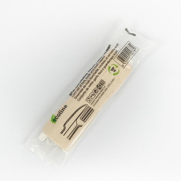 Kit couverts 3/1 (Fourchette, couteau et serviette kraft) en Amidon de maïs qualité alimentaire 70% et cire de polypropylène 30%