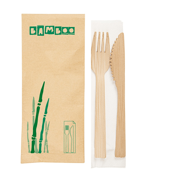 Set sachet de 2 couverts en bambou 17 cm et une serviette - Pack de  50 sets