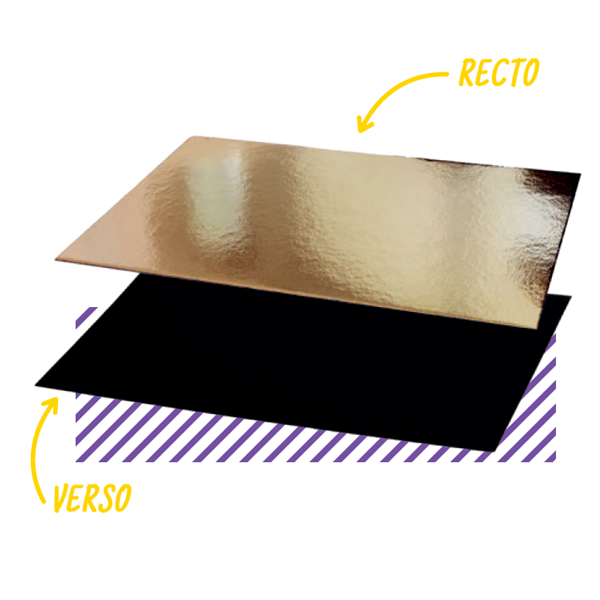 Carton à pâtisserie de forme rectangulaire d'une épaisseur de 1000 g/m² avec une face couleur Or et une face couleur Noir.